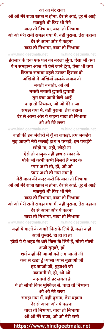 Lyrics of O Mere Raajaa Kafaa Na Honaa - ओ मेरे राजा खफ़ा ना होना