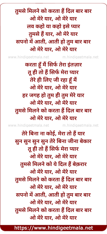 Lyrics of O Mere Yaar - तुमसे मिलने को करता हैं दिल बार बार