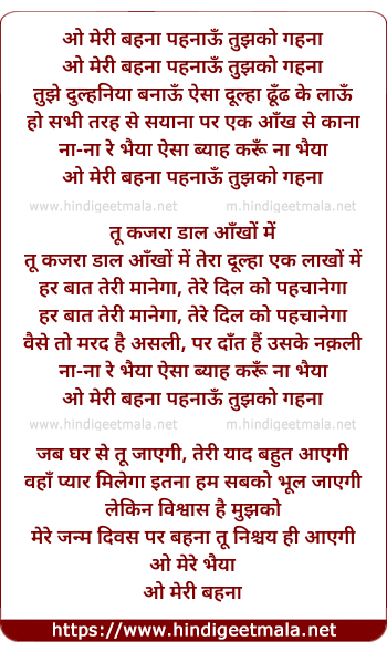 Lyrics of O Meri Bahna Pahanau Tujhko Gahna - ओ मेरी बहना पहनाऊँ तुझको गहना