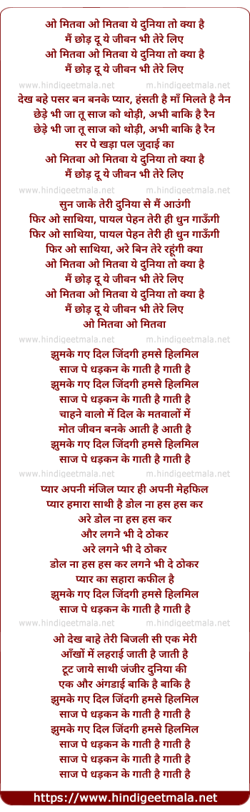 Lyrics of O Mittwa Yeh Duniya To Kya Hai - ओ मितवा ये दुनिया तो क्या है