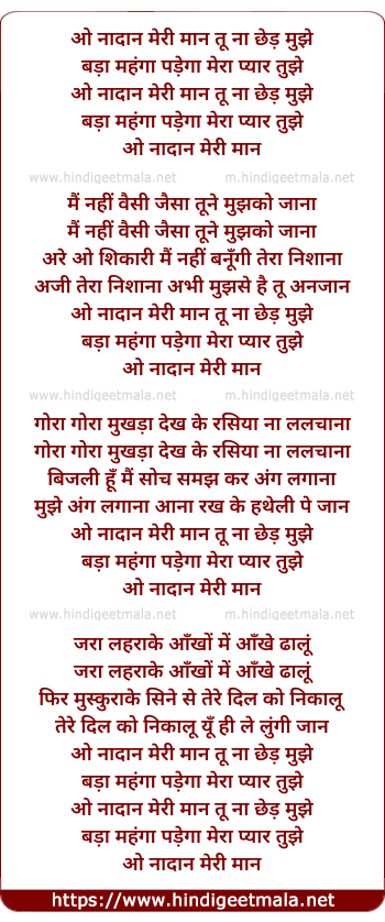 Lyrics of O Naadan Meri Maan Tu Na Chhed Mujhe - ओ नादान मेरी मान तू ना छेड़ मुझे