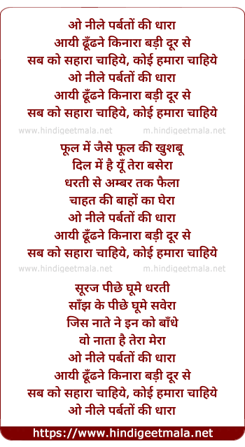 Lyrics of O Nile Parbaton Ki Dhaaraa - ओ नीले पर्बतों की धारा