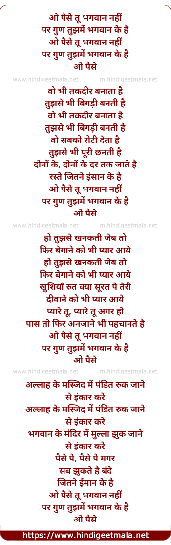 Lyrics of O Paise Tu Bhagwan Nahi - ओ पैसे तू भगवान नहीं