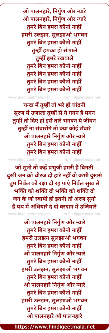 Lyrics of O Palanhare, Nirgun Aur Nyare - ओ पालनहारे निरगुन और न्यारे