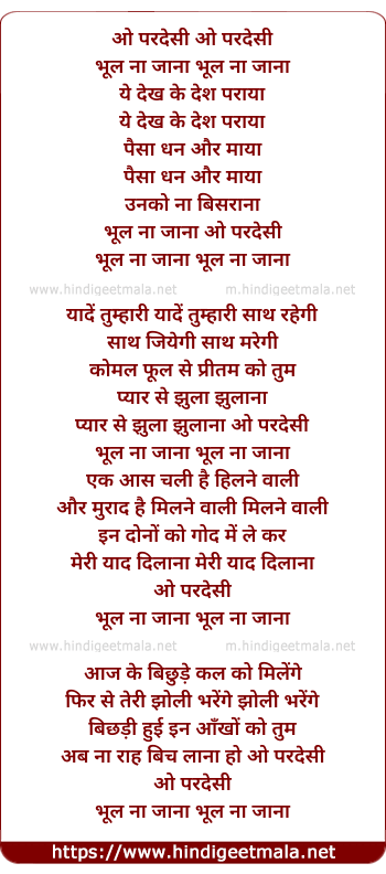 Lyrics of O Pardesi Bhool Na Jana - ओ परदेसी ओ परदेसी