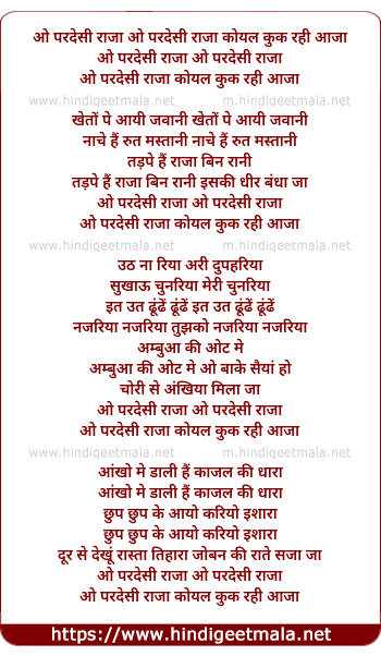Lyrics of O Pardesi Raja Koyal Kuke - ओ परदेसी राजा ओ परदेसी राजा कोयल कुक रही आजा
