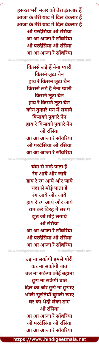 Lyrics of O Pardesiya O Rasiya - हसरत भरी नजर को तेरा इंतजार हैं