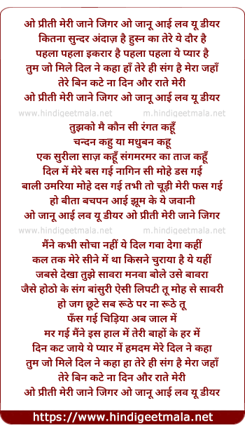 Lyrics of O Preeti Mere Jane Jigar - ओ प्रीती मेरी जाने जिगर