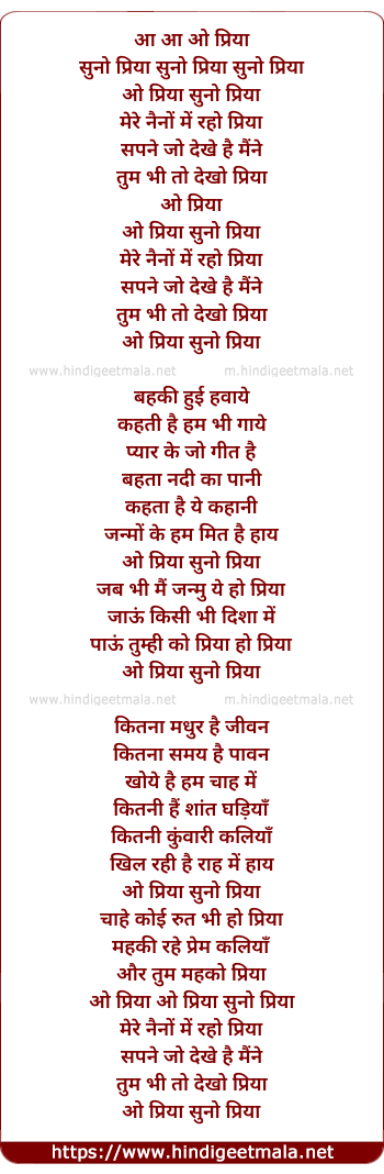 Lyrics of O Priyaa Suno Priyaa Mere Nainon Mein Raho - ओ प्रिया सुनो प्रिया मेरे नैनों में रहो