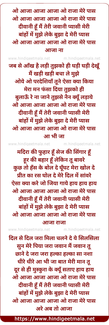 Lyrics of O Raja Aa Ja Na Mere Paas - ओ राजा आ जा ना मेरे पास