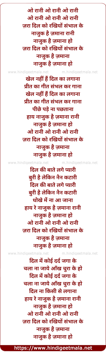 Lyrics of O Rani Zara Dil Ko - ओ रानी जरा दिल को