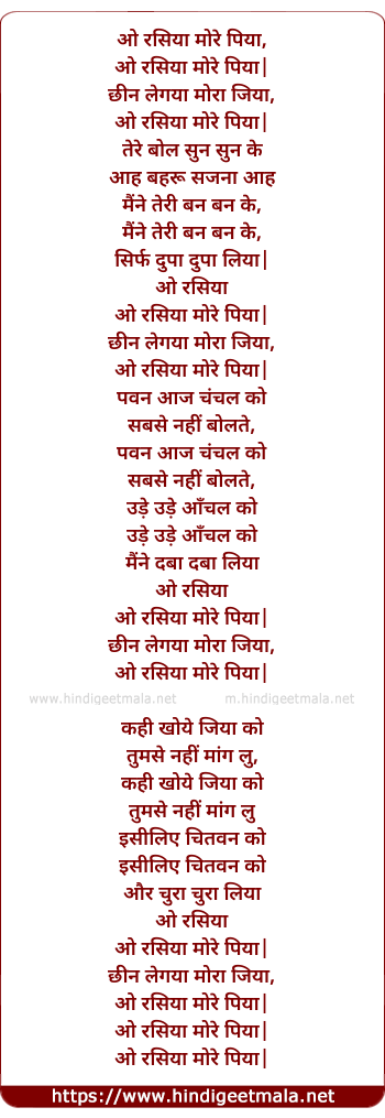Lyrics of O Rasiya More Piya