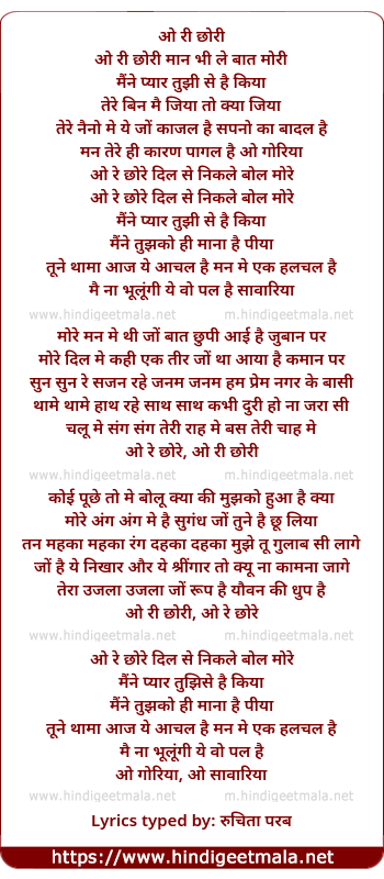 Lyrics of O Ri Chhori - ओ री छोरी