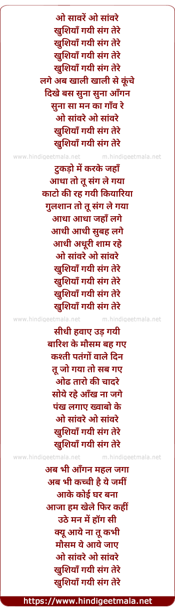 Lyrics of O Saawarein Khushiyan Gayi Sang Tere - ओ सांवरे खुशियाँ गयी संग तेरे