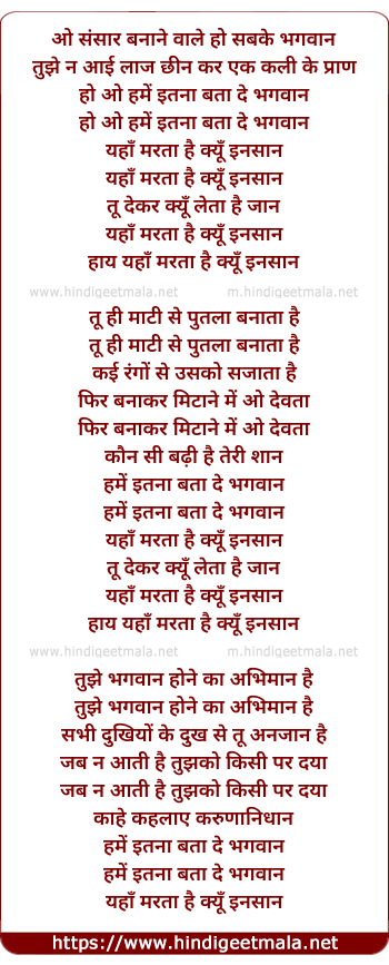 Lyrics of O Sansaar Banaane Vaale, Hamen Itanaa Bataa De Bhagavaan - ओ संसार बनाने वाले, हमें इतना बता दे भगवान