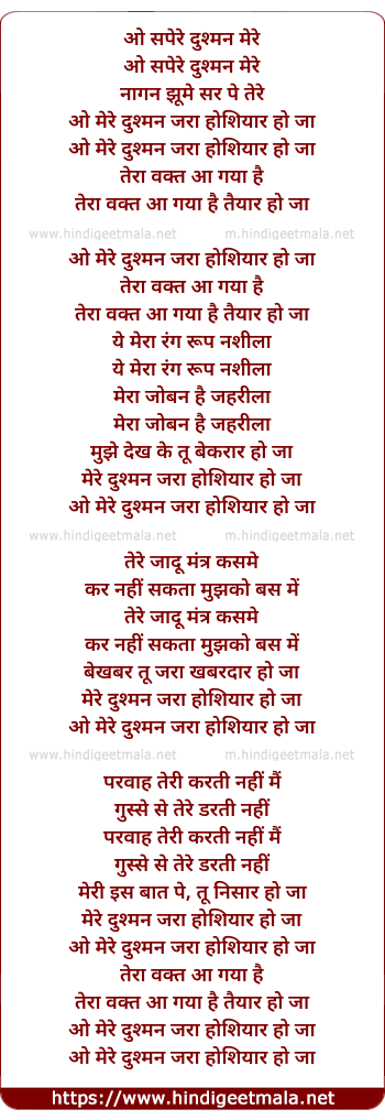 Lyrics of O Sapere Dushman Mere - ओ सपेरे दुश्मन मेरे
