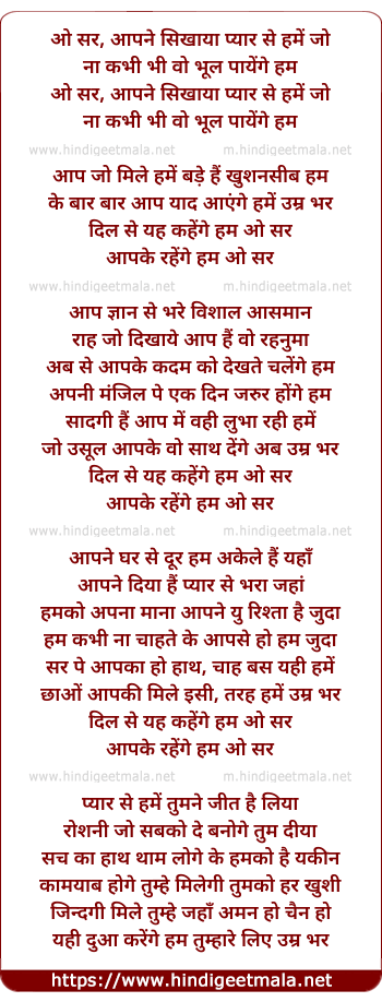 Lyrics of O Sir, Aapne Sikhaya Pyar Se Hame Jo - ओ सर, आपने सिखाया प्यार से हमें जो