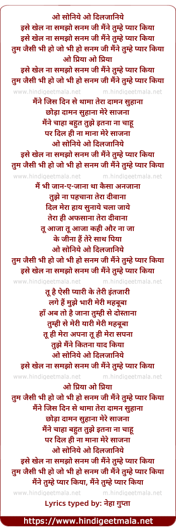 Lyrics of O Soniye O Dilajaaniye, Ise Khel Na Samajho Sanam - ओ सोनिये ओ दिलजानिये, इसे खेल ना समझो सनम