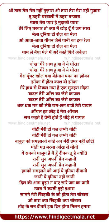 Lyrics of O Tara Tera Mera Nahi Gujara - ओ तारा तेरा मेरा नहीं गुज़ारा