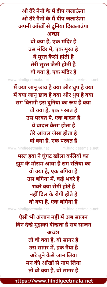 Lyrics of O Tere Nainon Ke Main Dip Jalaaungaa - ओ तेरे नैनो के मैं दीप जलाऊँगा