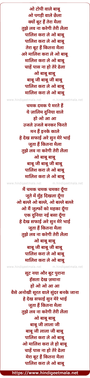 Lyrics of O Topi Wale Babu - ओ टोपी वाले बाबू