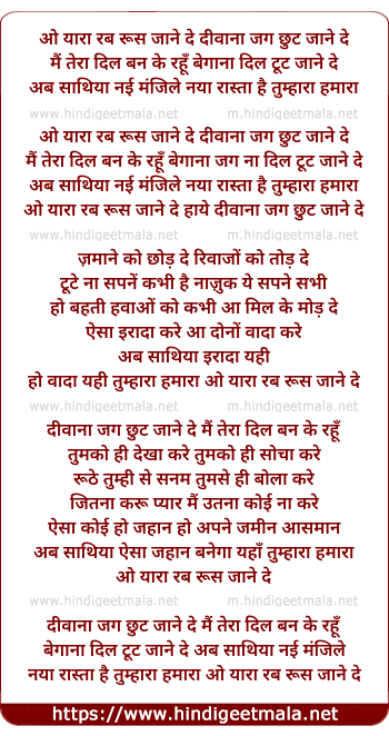 Lyrics of O Yara Rab Rus Jaane De - ओ यारा रब रूस जाने दे