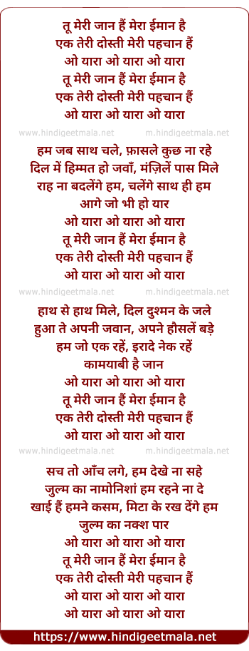 Lyrics of O Yaraa - तू मेरी जान हैं मेरा ईमान है