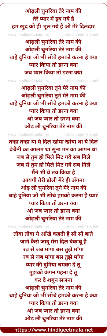 Lyrics of Odh Li Chunariyaa Tere Naam Ki - ओढ़ली चुनरिया तेरे नाम की