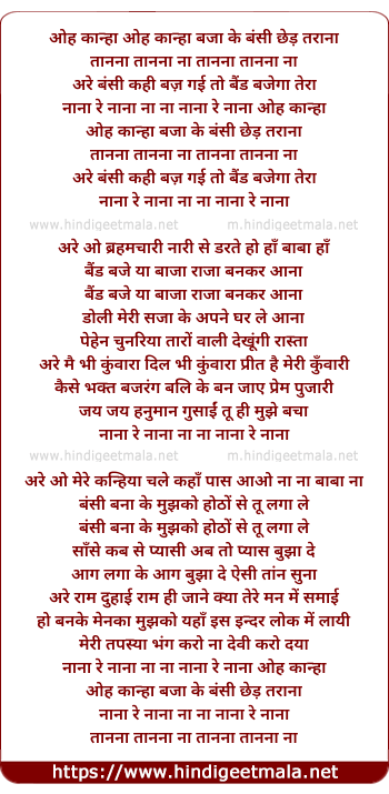 Lyrics of Oh Kanha Baja Ke Bansi Chhed Tarana - ओह कान्हा बजा के बंसी छेड़ तराना