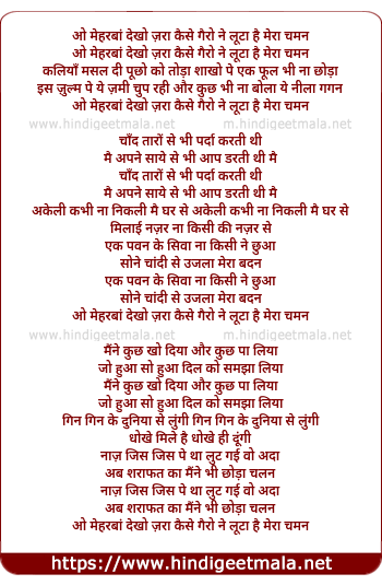 Lyrics of Oh Meherbaan Dekho Zara, Kaise Garu Ne Luta Hai Mera Chaman - ओ मेहरबां देखो ज़रा कैसे गैरो ने लूटा है मेरा चमन