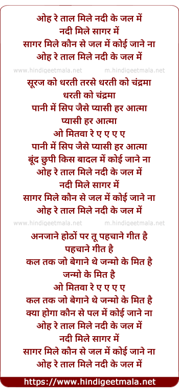 Lyrics of Oh Re Taal Mile Nadi Ke Jal Men - ओह रे ताल मिले नदी के जल में