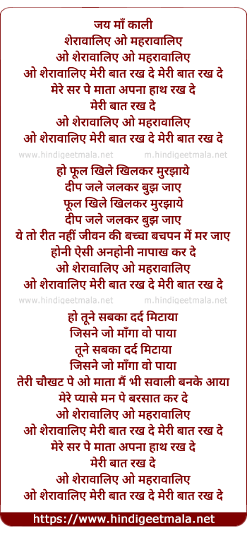 Lyrics of Oh Shera Waliye Oh Mehra Waliye - ओ शेरावालिए ओ महरा वालिए