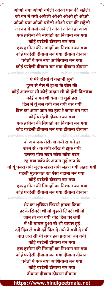 Lyrics of Oo Chmapa Oo Chamali - ओ चंपा ओ चमेली