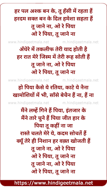 Lyrics of Ore Piya (Tu Jaane Na) - हर पल अश्क बन के, तू हँसी में रहता हैं