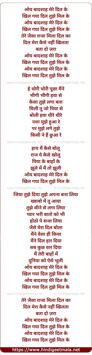 Lyrics of Oye Badshah Mera Dil Ke - ओय बादशाह मेरे दिल के