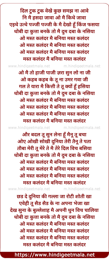 Lyrics of Oye Mast Kalandar Main Baniya Mast Kalandar - ओय मस्त कलंदर मै बनिया मस्त कलंदर