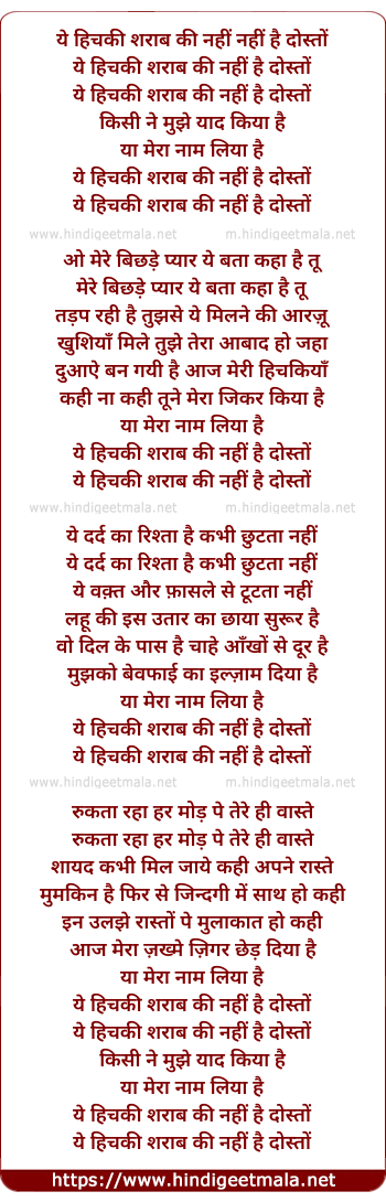Lyrics of Ye Hichaki Sharaab Ki Nahi Hai Dosto - ये हिचकी शराब की नहीं है दोस्तों