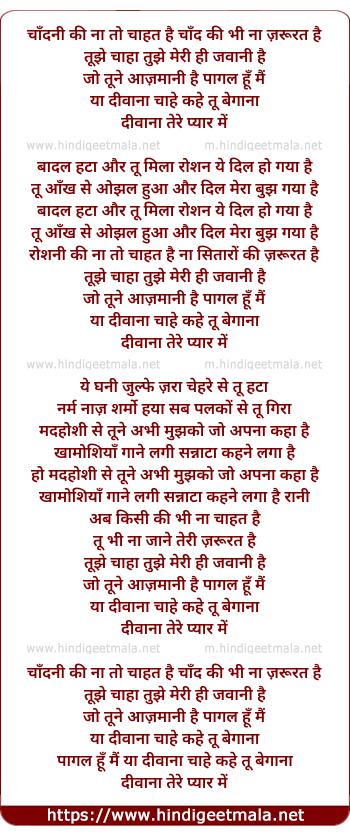 Lyrics of Pagal Hu Mai - चाँदनी की ना तो चाहत है चाँद की भी ना ज़रूरत है