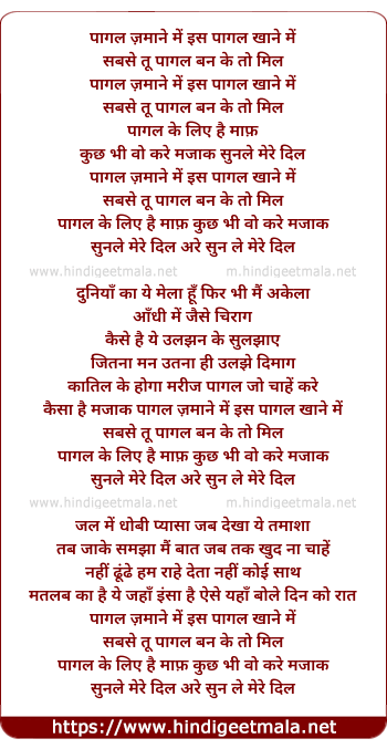Lyrics of Pagal Zamane Me Is Pagal Khane Me - पागल ज़माने में इस पागल खाने में