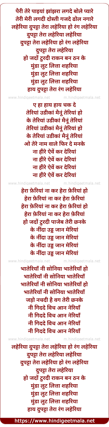Lyrics of Pairi Tere Paaiyaan, Dupattaa Teraa Laheriyaa - पैरी तेरे पाइयां झांझरा लगदे बोले प्यारे