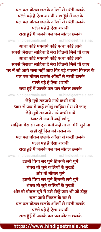 Lyrics of Pal Pal Botal Chalke, Aankho Se Masti Dhalke - पल पल बोतल छलके, आँखों से मस्ती ढलके