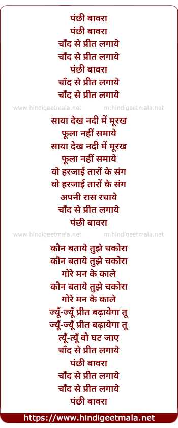 Lyrics of Panchhi Bawara Chand Se Prit Lagaye - पंछी बावरा चाँद से प्रीत लगाये