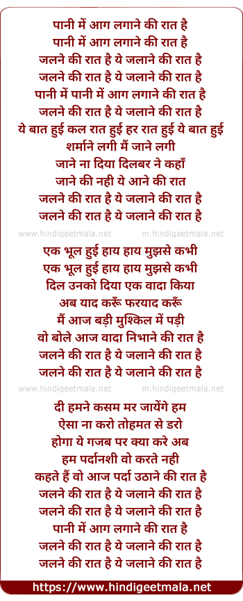 Lyrics of Pani Me Aag Lagane Ki Raat Hai - पानी में आग लगाने की रात है