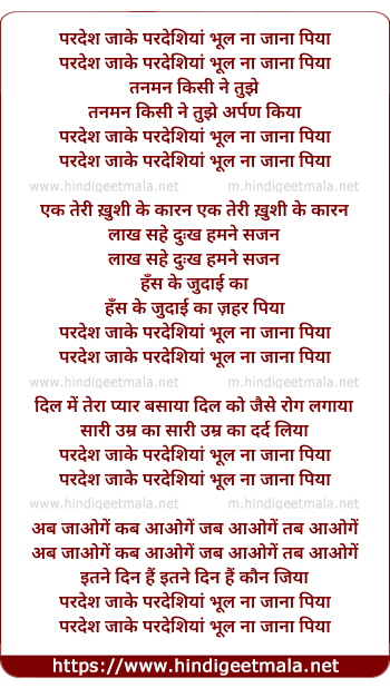 Lyrics of Pardesh Ja Ke Pardeshiya Bhul Na Jana Piya - परदेश जा के परदेशियां भूल ना जाना पिया