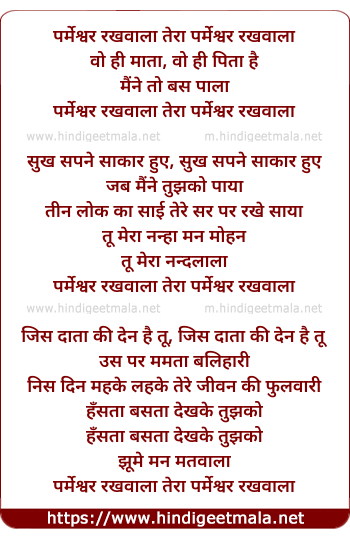 Lyrics of Parmeshvar Rakhavaalaa Teraa - पर्मेश्वर रखवाला तेरा