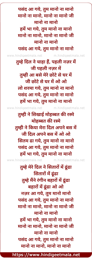 Lyrics of Pasand Aa Gaye Tum Mano Na Mano - पसंद आ गये, तुम मानो ना मानो