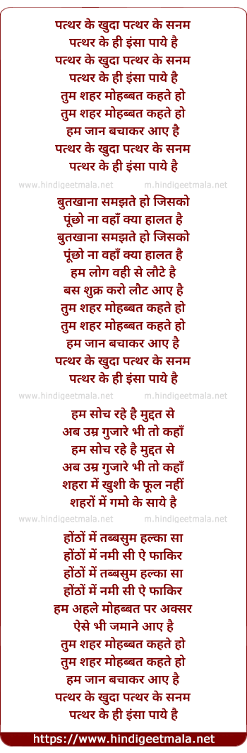 Patthar Hai Kudaa Patthar Ke Sanam - पत्थर के खुदा पत्थर के सनम
