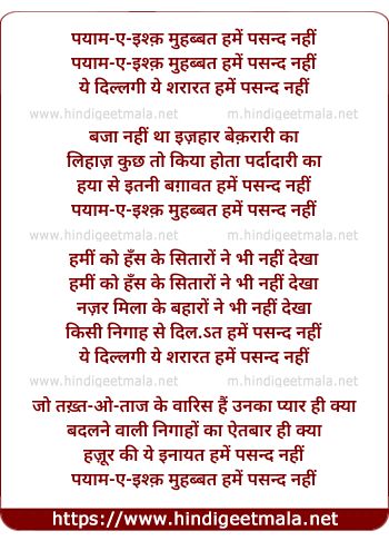Lyrics of Payaam E Ishq Muhabbat Hame Pasand Nahi - पयाम-ए-इश्क़ मुहब्बत हमें पसन्द नहीं