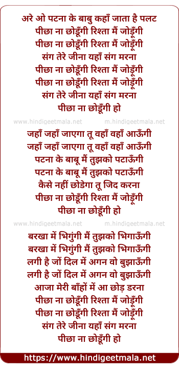 Lyrics of Peechha Na Chhodoongi - पीछा ना छोडूँगी