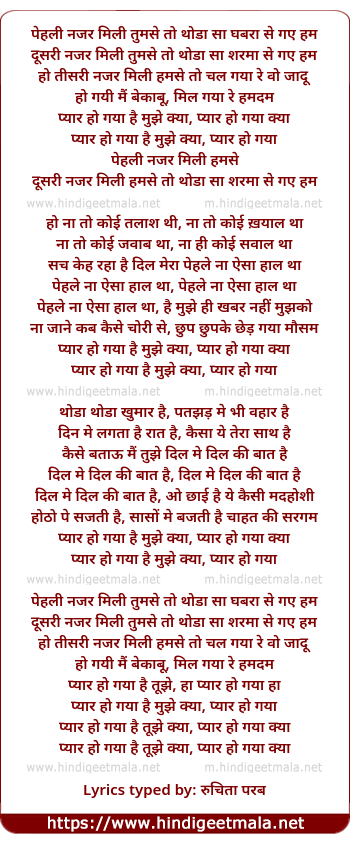 Lyrics of Pehalee Najar Milee Tumse - पहली नजर मिली तुमसे